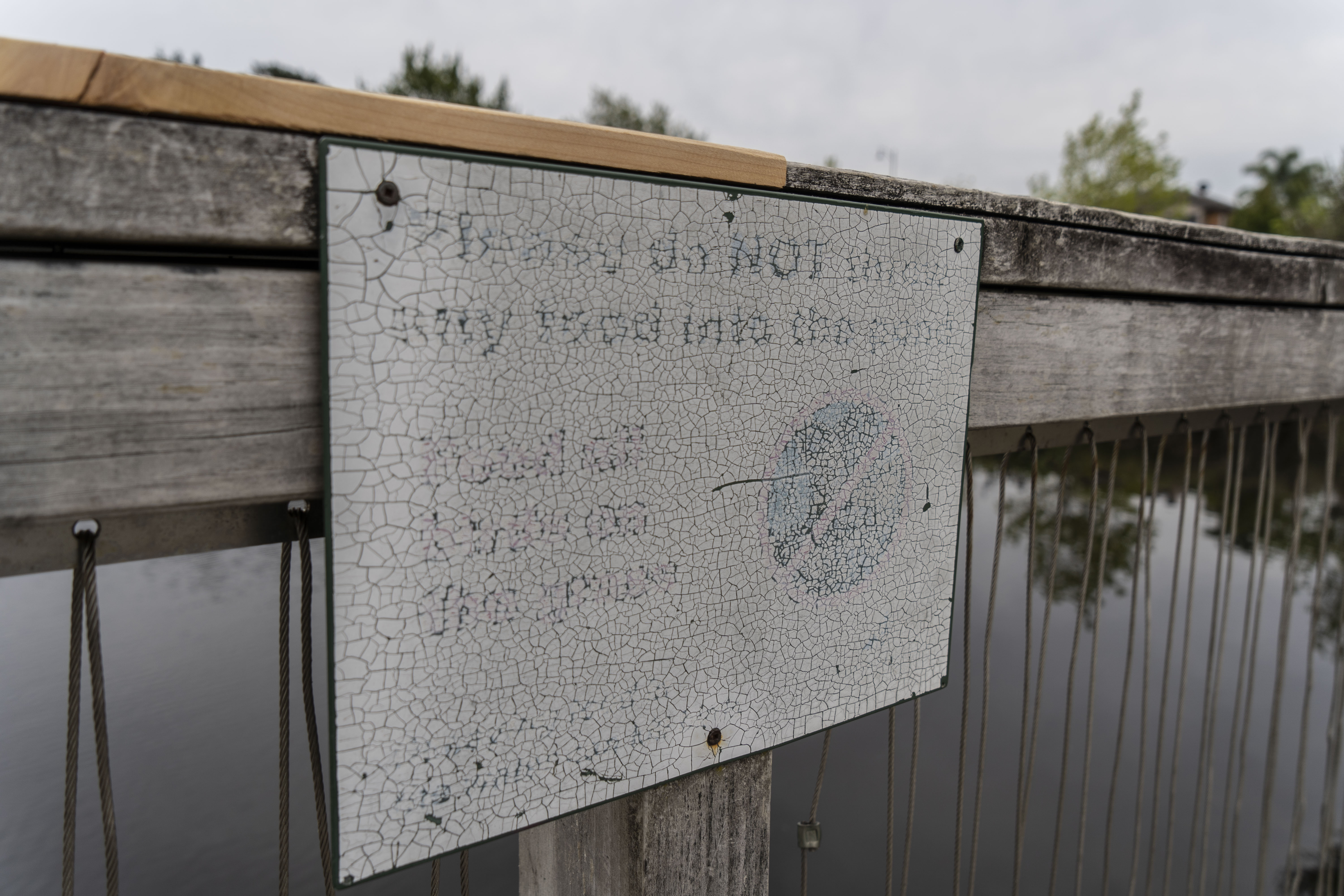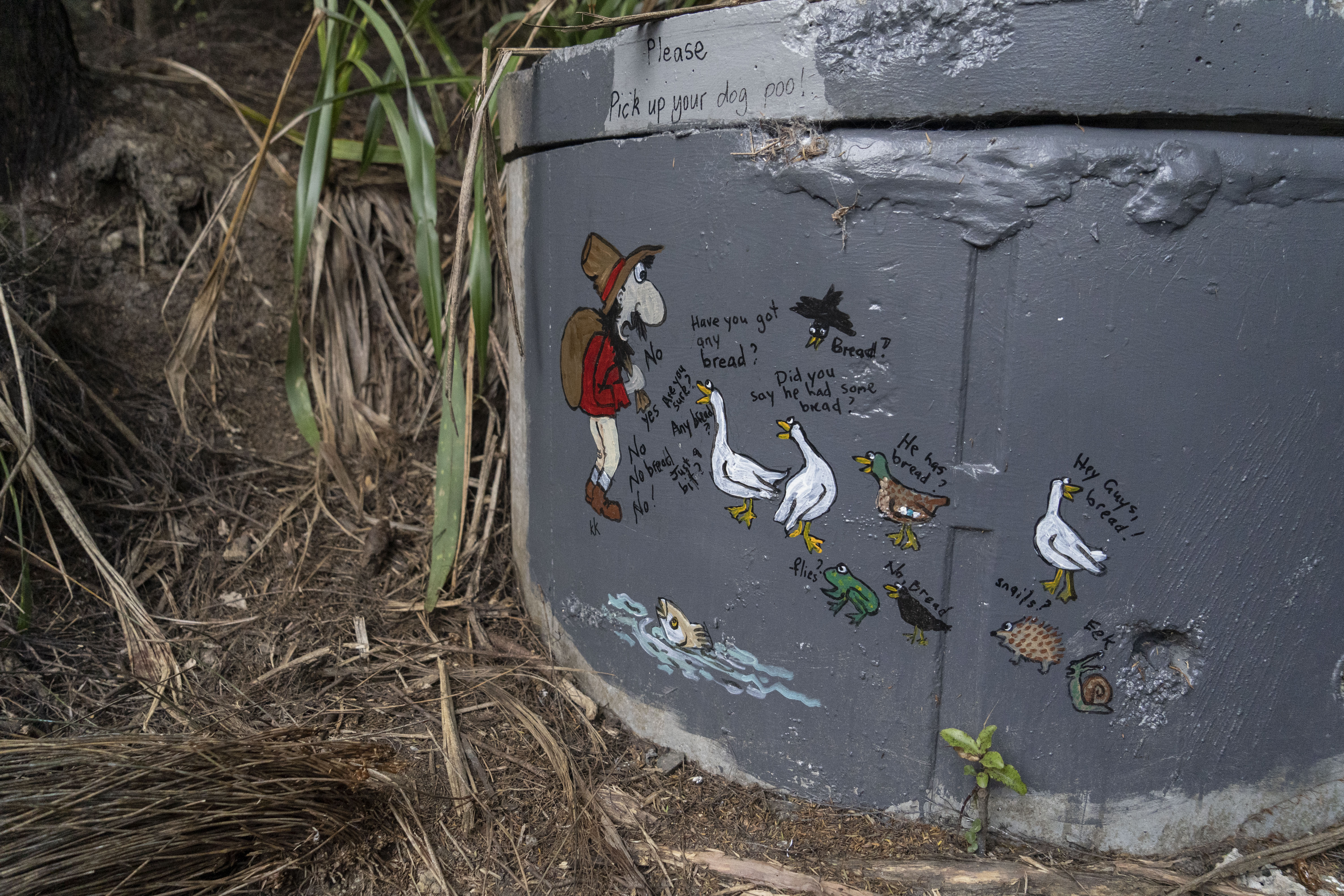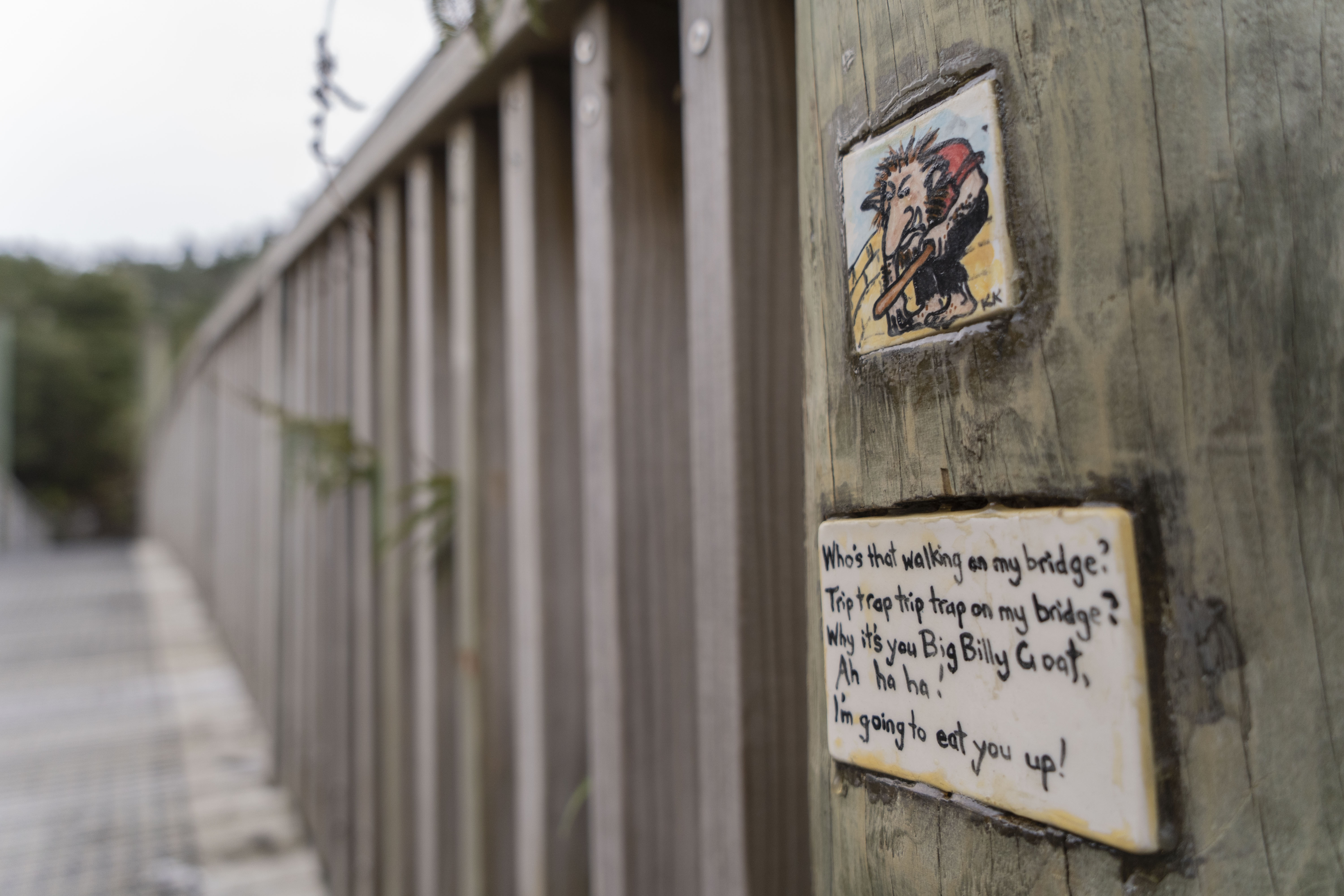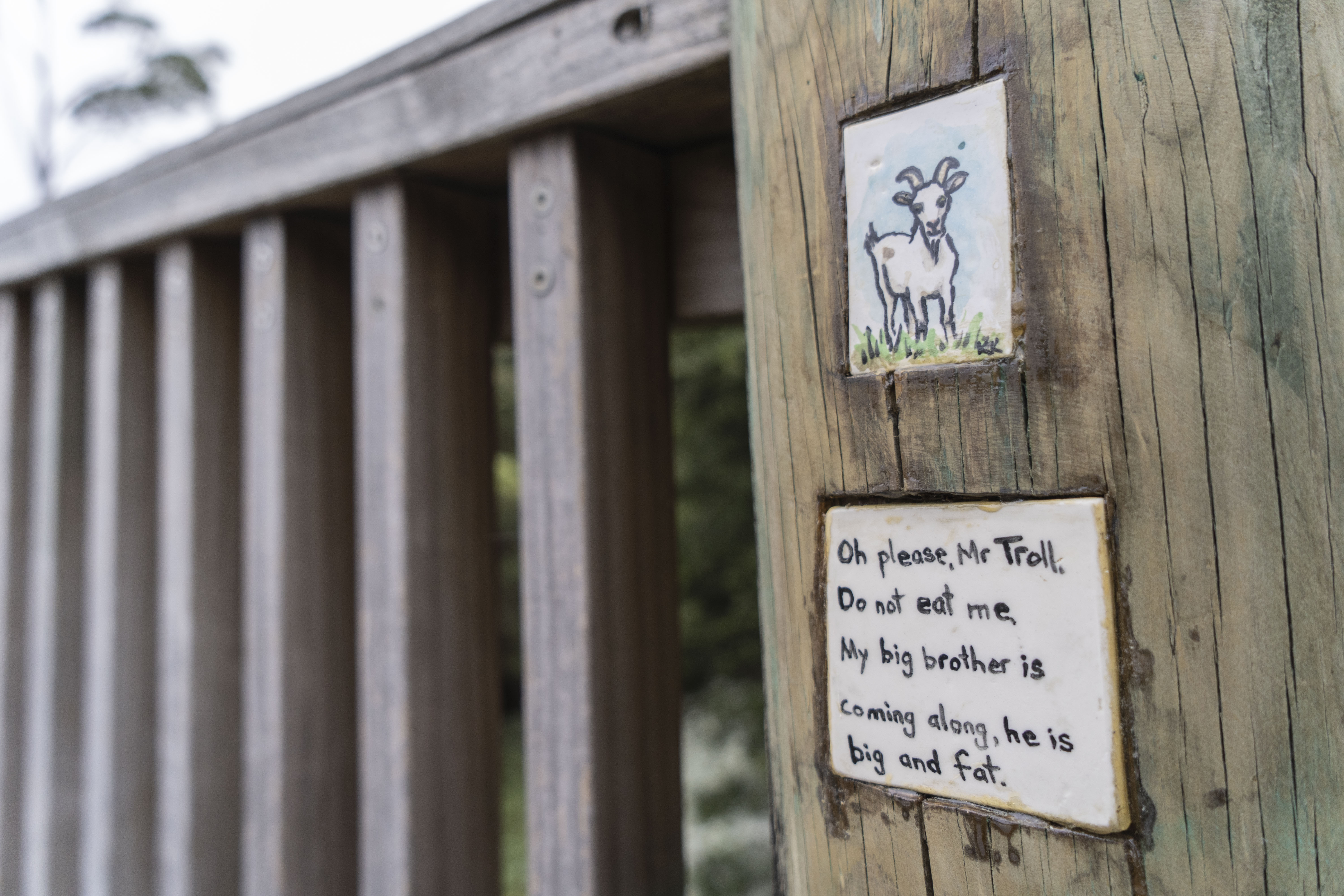 These were other types of typography that I had found around the Lake but they appear to be hand-drawn/written. Some of these handwritten typefaces were painted onto rocks or on a tile looking board which was stuck on the bridge. On the tile boards, they had parts of the ‘Billy goat gruff’ fairytale written on it. I think that it was put on here as a reference to the ‘troll under the bridge’ from the story. So I could see that whoever put it on the bridge was also trying to connect the physical bridge to this child’s fairytale story.