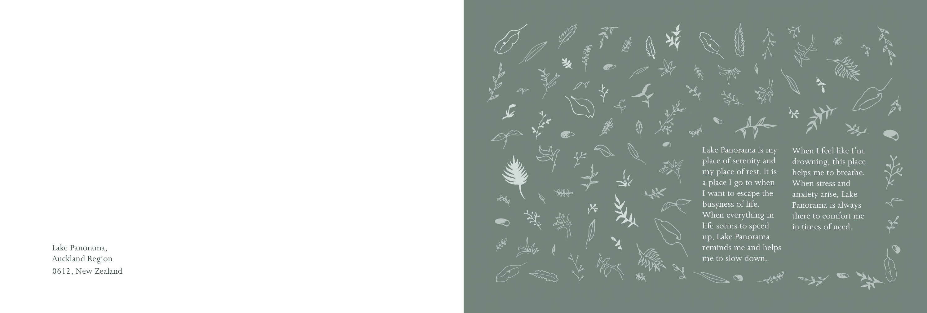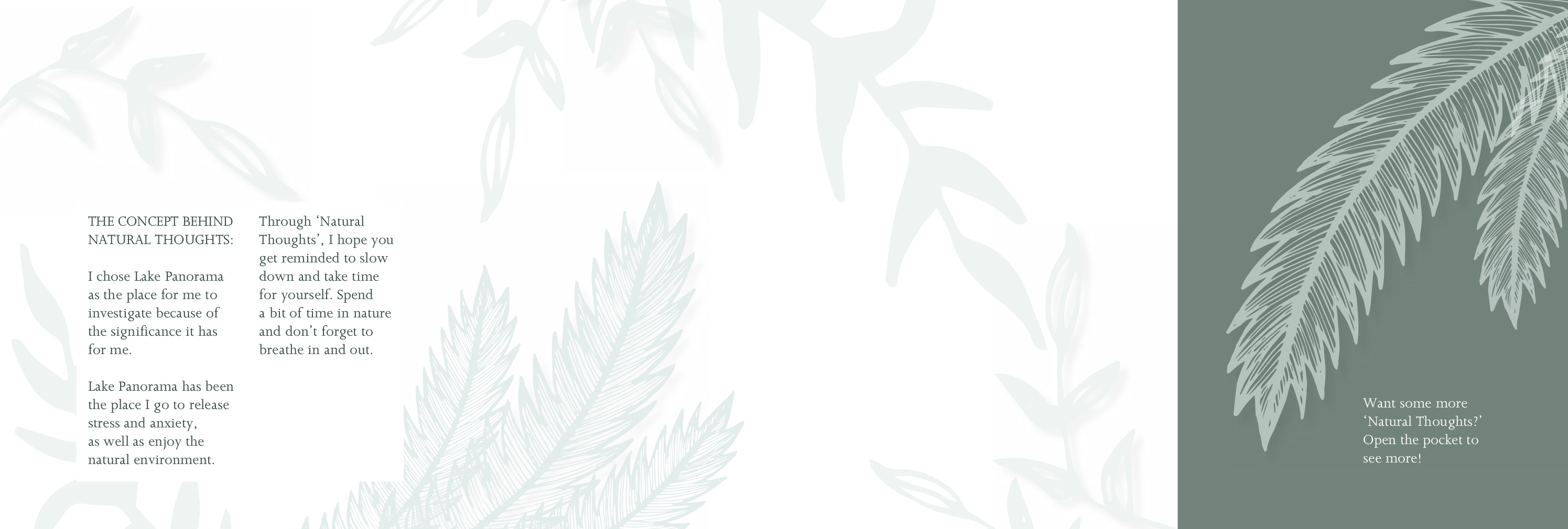 Another thing I forgot to mention was that the title of my project was named ‘Natural thoughts’ as I thought it had a nice ring to it and showcased the two sides of a connection. Mind and place. ‘Natural’ being the environment of Lake Panorama and ‘Thoughts’ being the unseen part which resembles the mind.